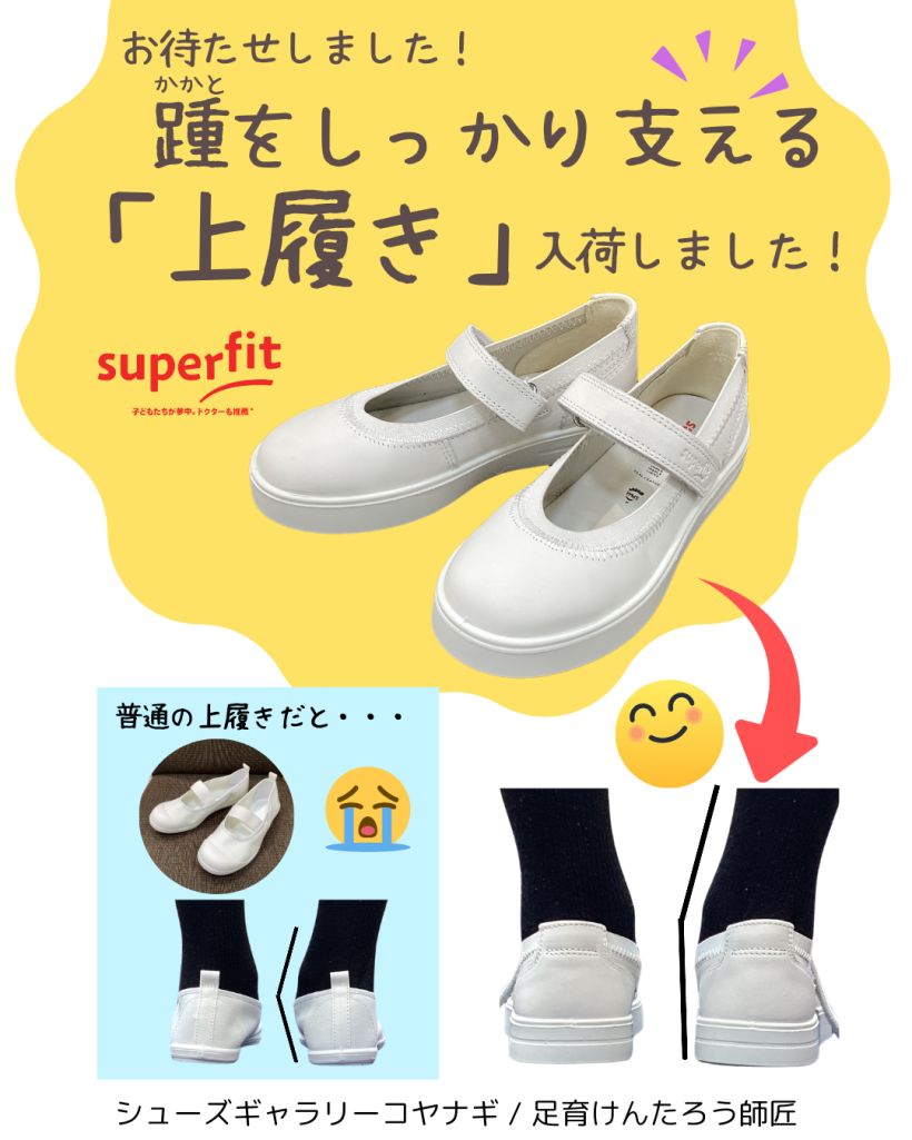 2025年04月16日(水) お知らせ 【スーパーフィット】上履き入荷! シューズギャラリーコヤナギの 「足と靴のお困りごと解決」専門家、「足育けんたろう師匠」こと荻野健太郎です! 今日は「子ども靴新商品」入荷のお知らせです
