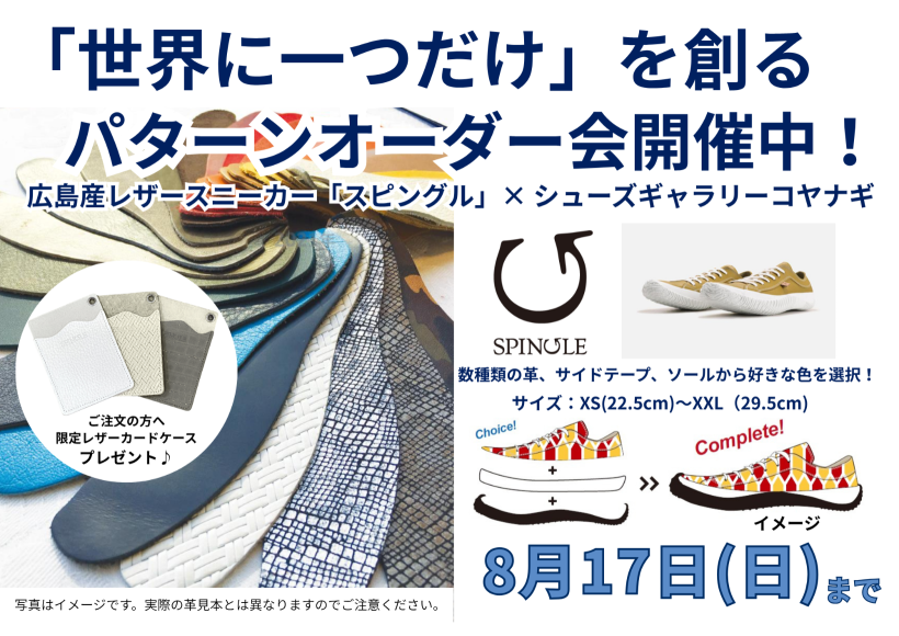 2025年08月07日(木) お知らせ 【2025年8月17日まで】スピングル「パターンオーダー会」開催!! こんにちは! シューズギャラリーコヤナギの 「足と靴のお困りごと解決」専門家、荻野健太郎です^^ ◤◢◤◢◤◢◤◢◤◢◤◢ ✨世界にひとつだけの、 私だけの一足✨ ◤◢◤◢◤◢◤◢◤◢◤◢ \スピングル パターンオーダー会開催中!/ 上質な広島レザーを使い、職人が一足ずつ丁寧に手作り。 カラー・素材・ソールまで、自分好みにカスタマイズできます。 期間は【8月17日(日)まで】 「おしゃれも、歩きやすさも、妥協したくない」 そんなあなたへ。 ぜひこの特別な体験をお見逃しなく