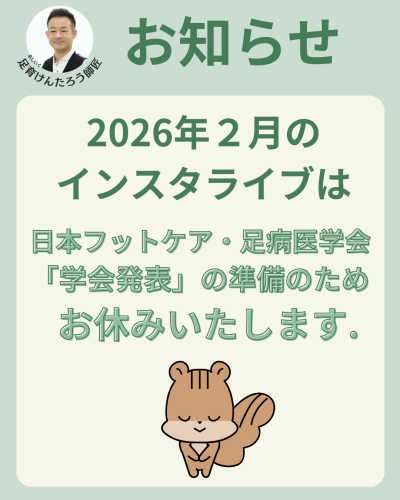2026年02月04日(水) お知らせ NEW 2026年2月 インスタライブお休みのお知らせ シューズギャラリーコヤナギの 「足と靴のお困りごと解決」専門家、 「足育けんたろう師匠」こと荻野健太郎です! 【お知らせ】 2026年2月のインスタライブは、 日本フットケア・足病医学会での 学会発表準備のため お休みさせていただきます。